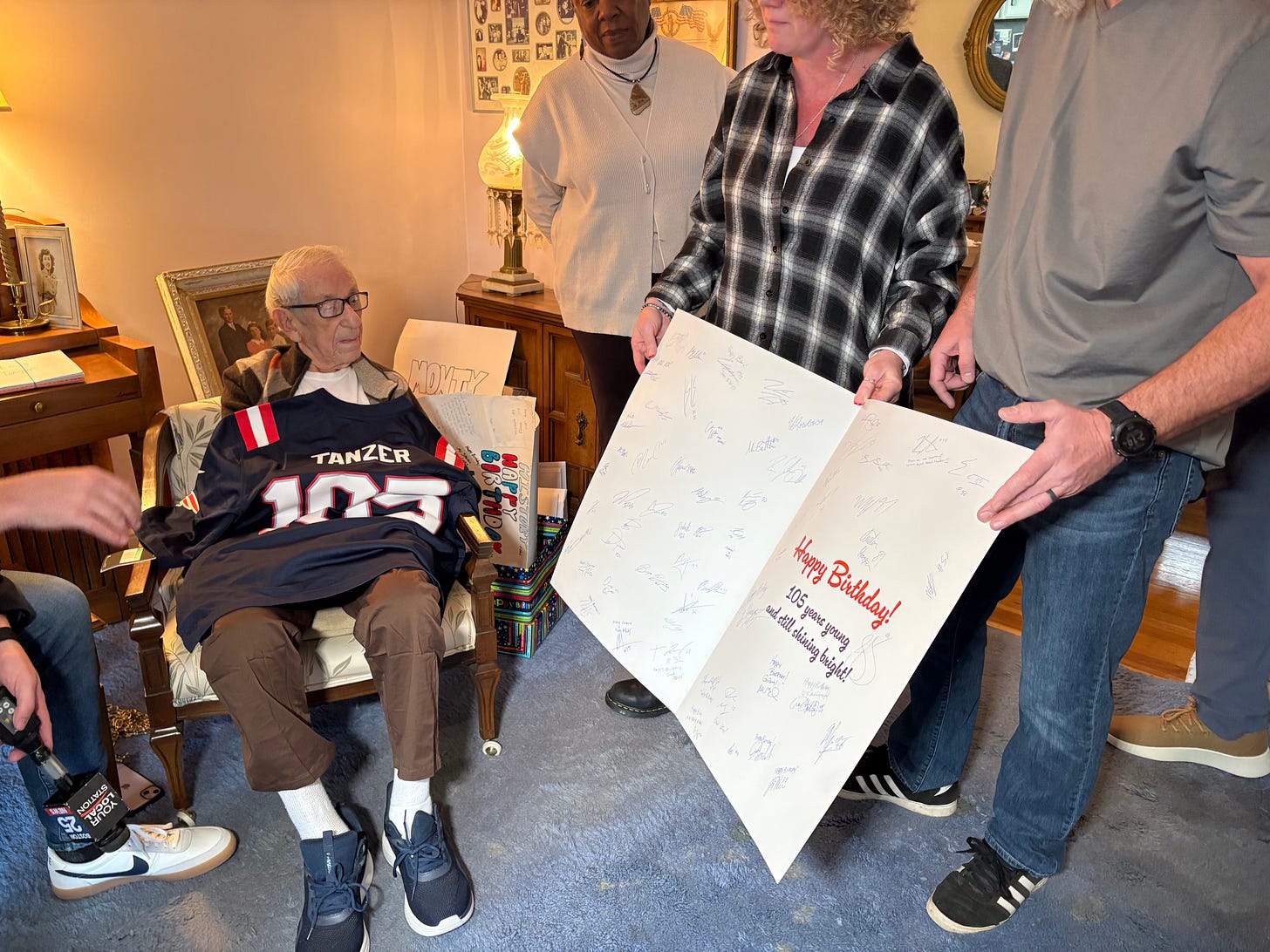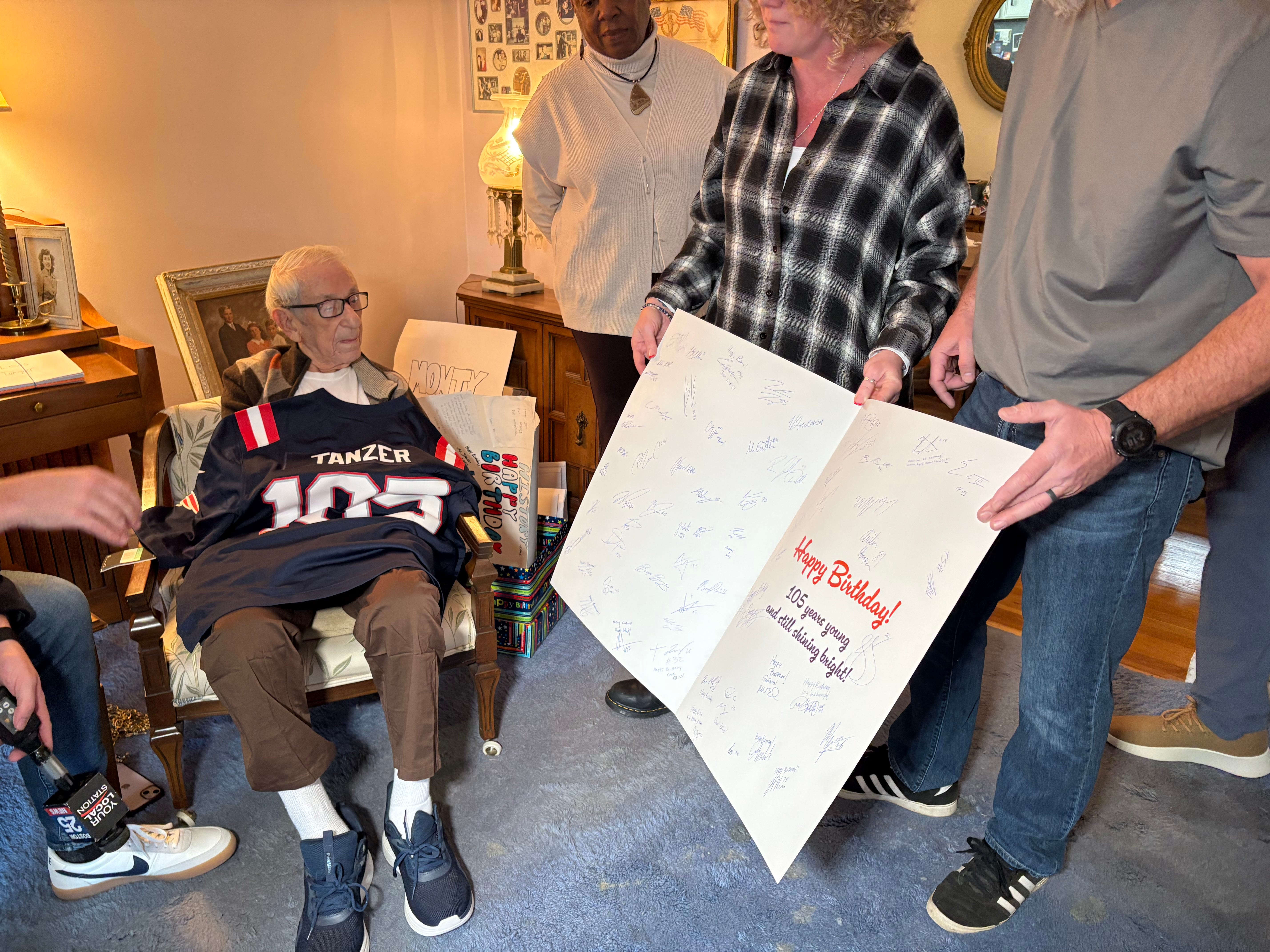 In a matter of just a few weeks, about 1,000 birthday cards have poured in, from all over the country, many of them from schools. The New England Patriots sent an oversized birthday card signed by all the players and a Patriots jersey with the name “Tanzer” and the number “105” on the back. Patriots owner Robert Kraft called over Zoom to personally wish him a happy birthday.